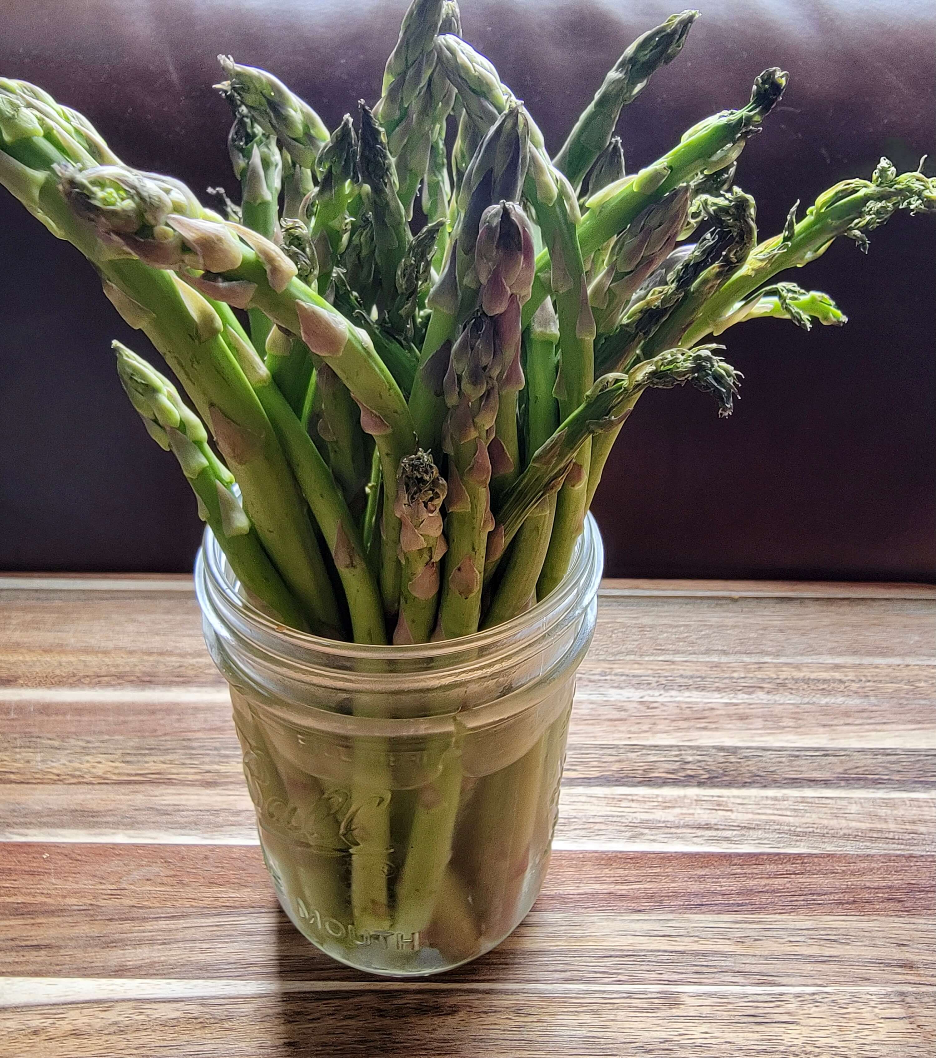Unlike other items which are stored in an airtight container, I store asparagus in an open mason jar similar to fresh flowers. I use filtered water because tap water might have too much chlorine and kill the asparagus. We have a Boroux water filtration system in our home but you can use any filtered water that you drink. You can store the mason jar in the door of your refrigerator or on the top shelf if you have room. This is the same method I use for storing fresh herbs.