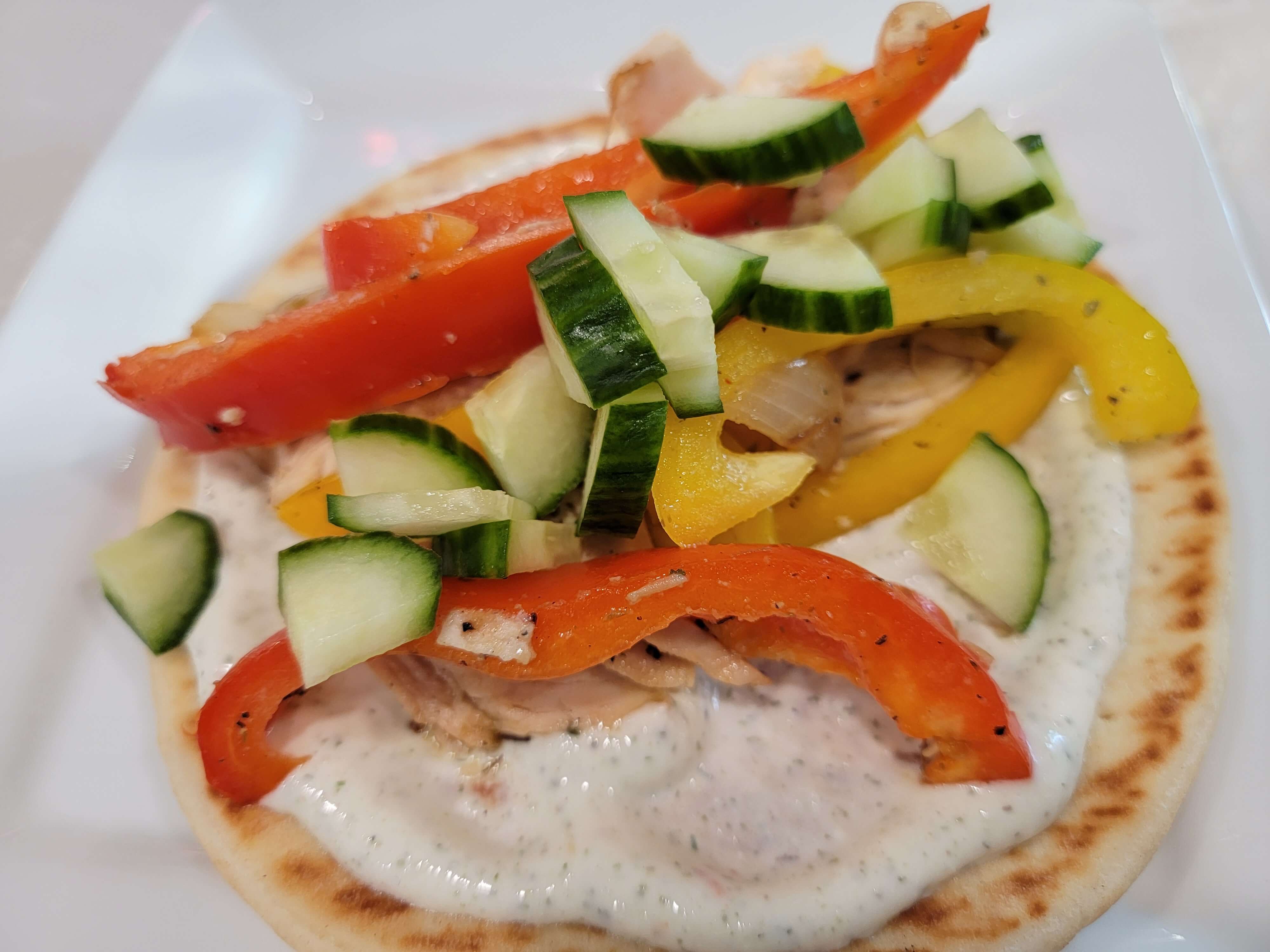 When it comes to making our gyros we will put a variety of ingredients on them and often times it has to go with what we have in the fridge! Usually will use chicken that Mike grills on the blackstone or leftover rotisserie chicken. Being able to take rotisserie chicken from the freezer makes this a meal that can be made without too much prep work. When it comes to veggies we will use peppers, onions, and cucumbers. I also top them with feta cheese.