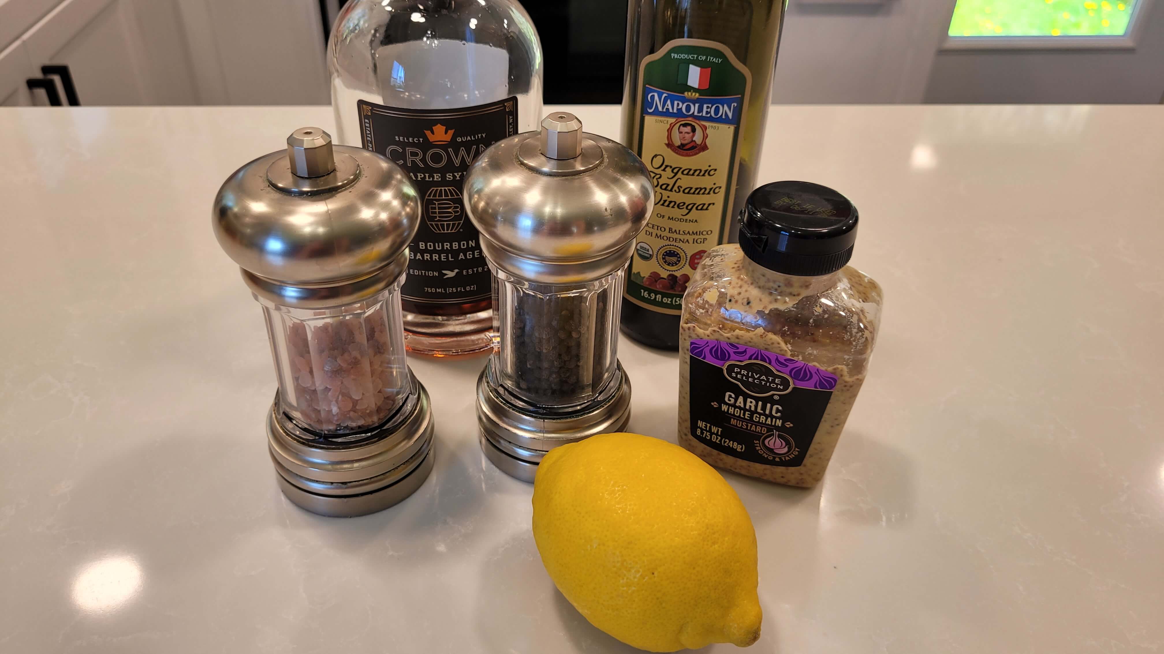 Making homemade salad dressings allows you to know the ingredients that are in them. In this recipe, I make a simple vinaigrette. It is equal parts oil, balsamic vinegar, and mustard. I used a whole grain mustard but you could also use a dijon. In addition to those, add the juice of a lemon as well as salt and pepper to taste.
