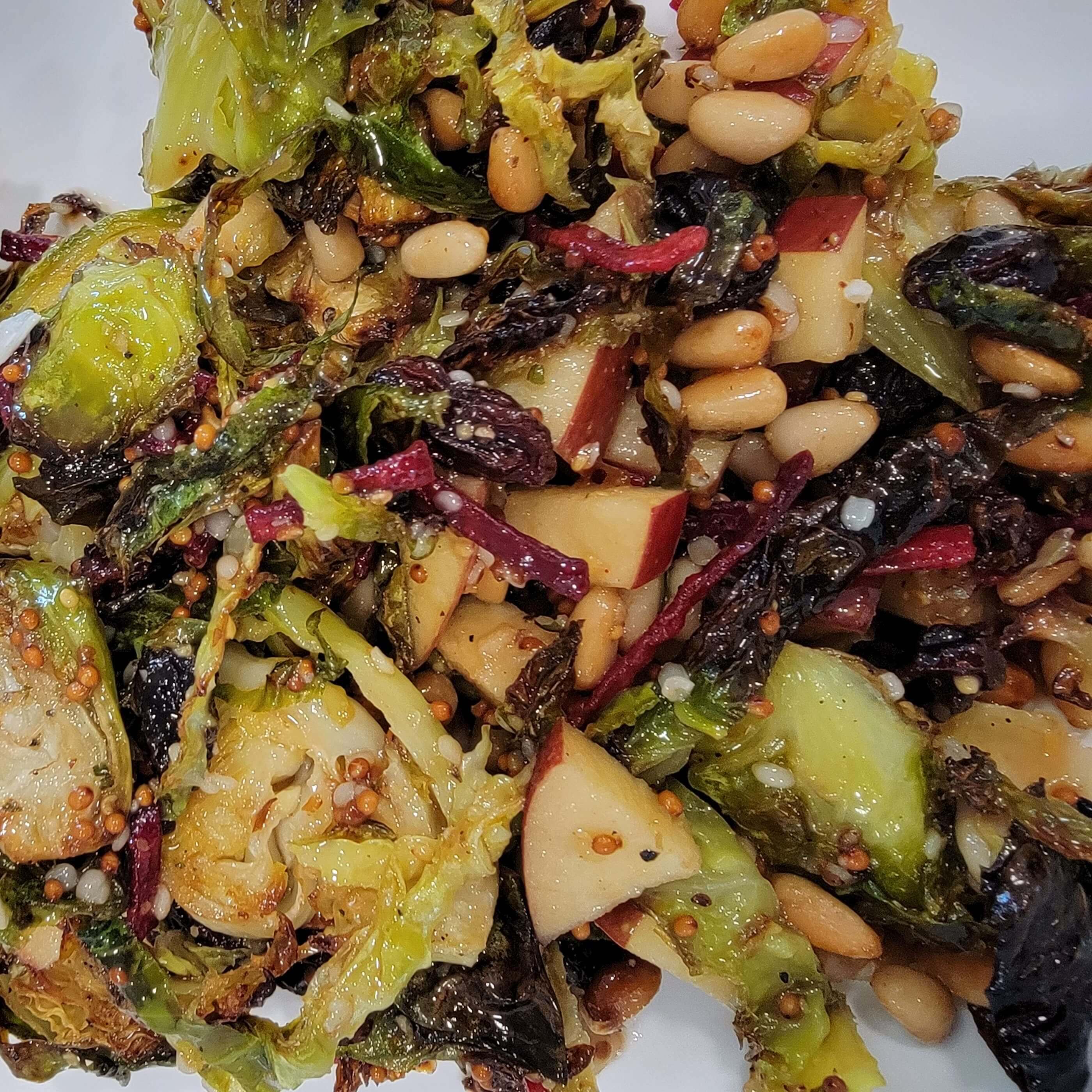 I use this salad as an opportunity to reduce waste and use up items that I have in my home that I want to use up. For example, I had raisins that were starting to dry out, but when I baked them in this recipe they plumped up and tasted delicious.