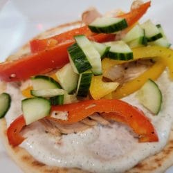 When it comes to making our gyros we will put a variety of ingredients on them and often times it has to go with what we have in the fridge! Usually will use chicken that Mike grills on the blackstone or leftover rotisserie chicken. Being able to take rotisserie chicken from the freezer makes this a meal that can be made without too much prep work. When it comes to veggies we will use peppers, onions, and cucumbers. I also top them with feta cheese.