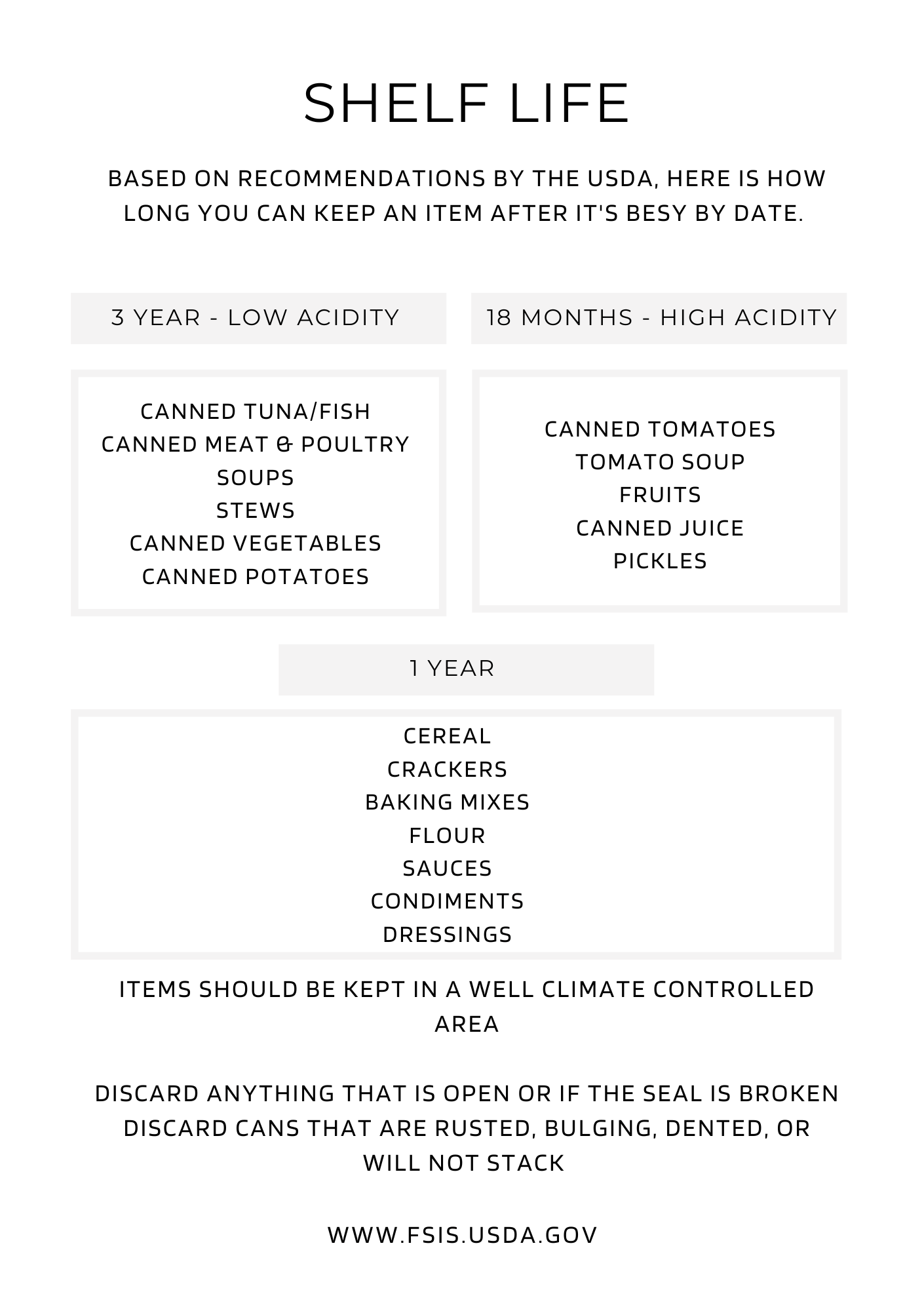 When you are stocking items in your pantry it is important to be aware of the shelf life of your items. Additionally, did you know that items last longer than their written expiration dates? The chart below shows recommendations from the USDA on how long items can be kept after the date written on them and still be safely consumed.