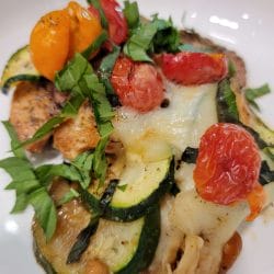 - Return chicken to the skillet, nestling into the onions and glaze. Scatter tomatoes and zucchini around the chicken and top each breast with mozzarella.