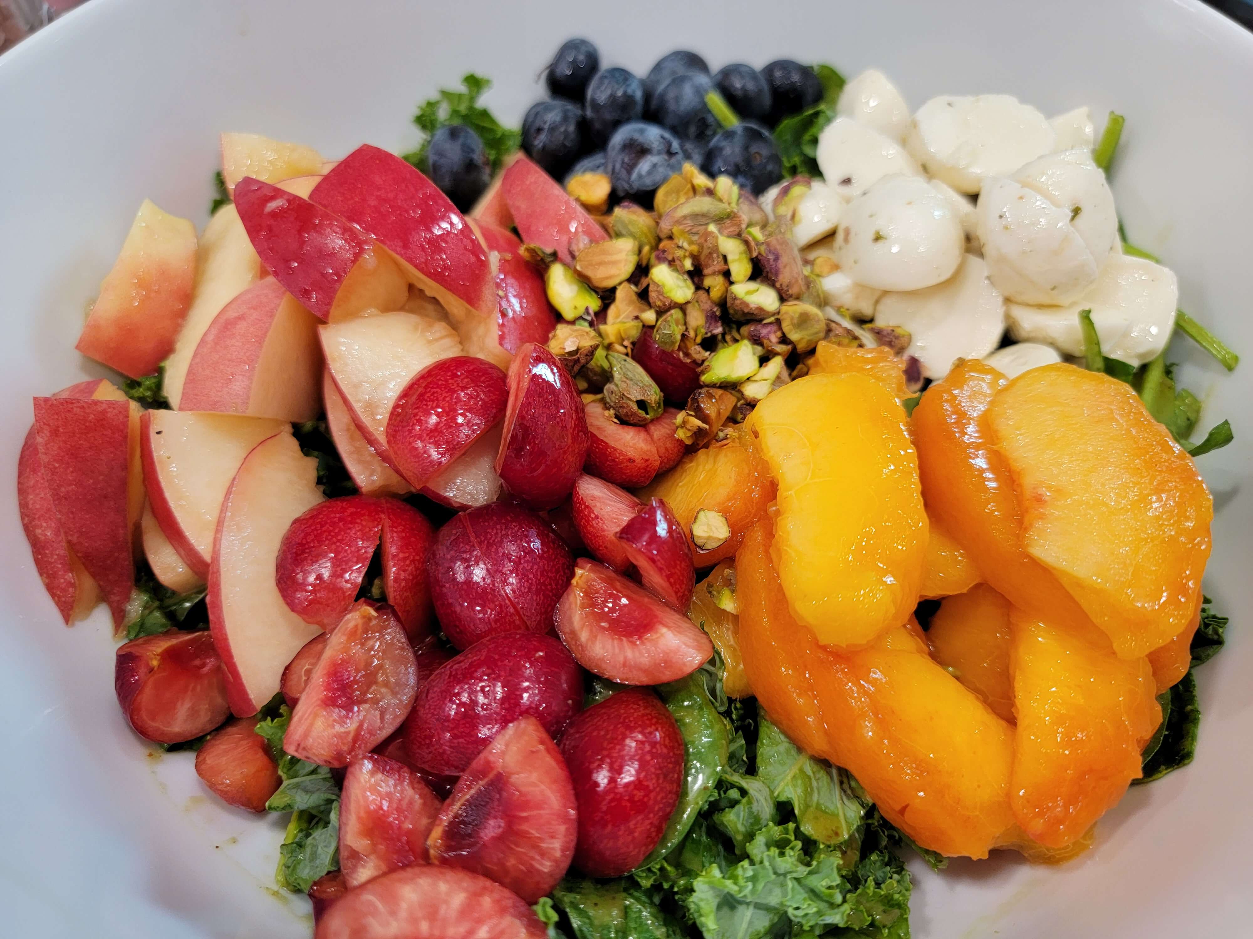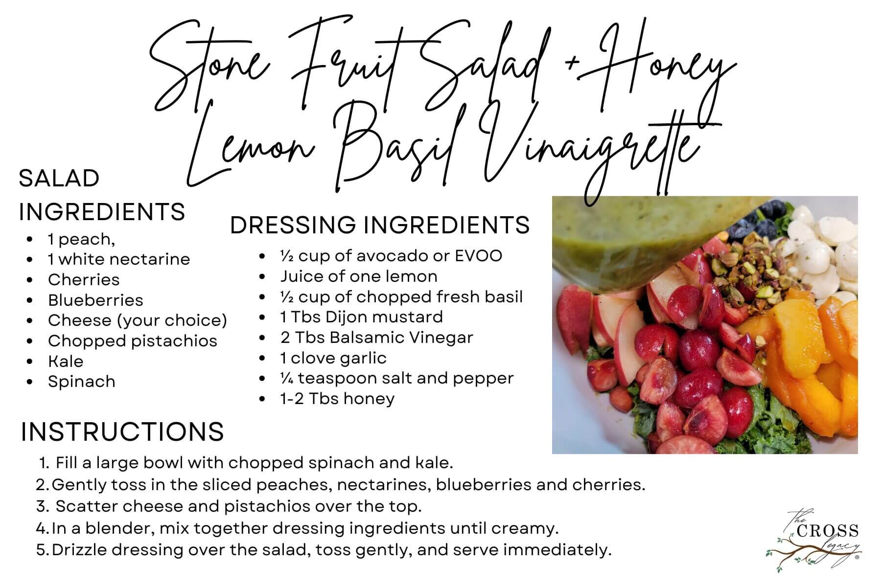 If your garden or farmer’s market is overflowing with summer produce right now, this is the salad for you. Sweet stone fruits like peaches and nectarines, juicy cherries, and even a handful of blueberries come together with crisp greens, creamy mozzarella, and crunchy pistachios. But the real star? A creamy, herb-packed vinaigrette that’s bursting with lemon, basil, mint, and just the right touch of honey.