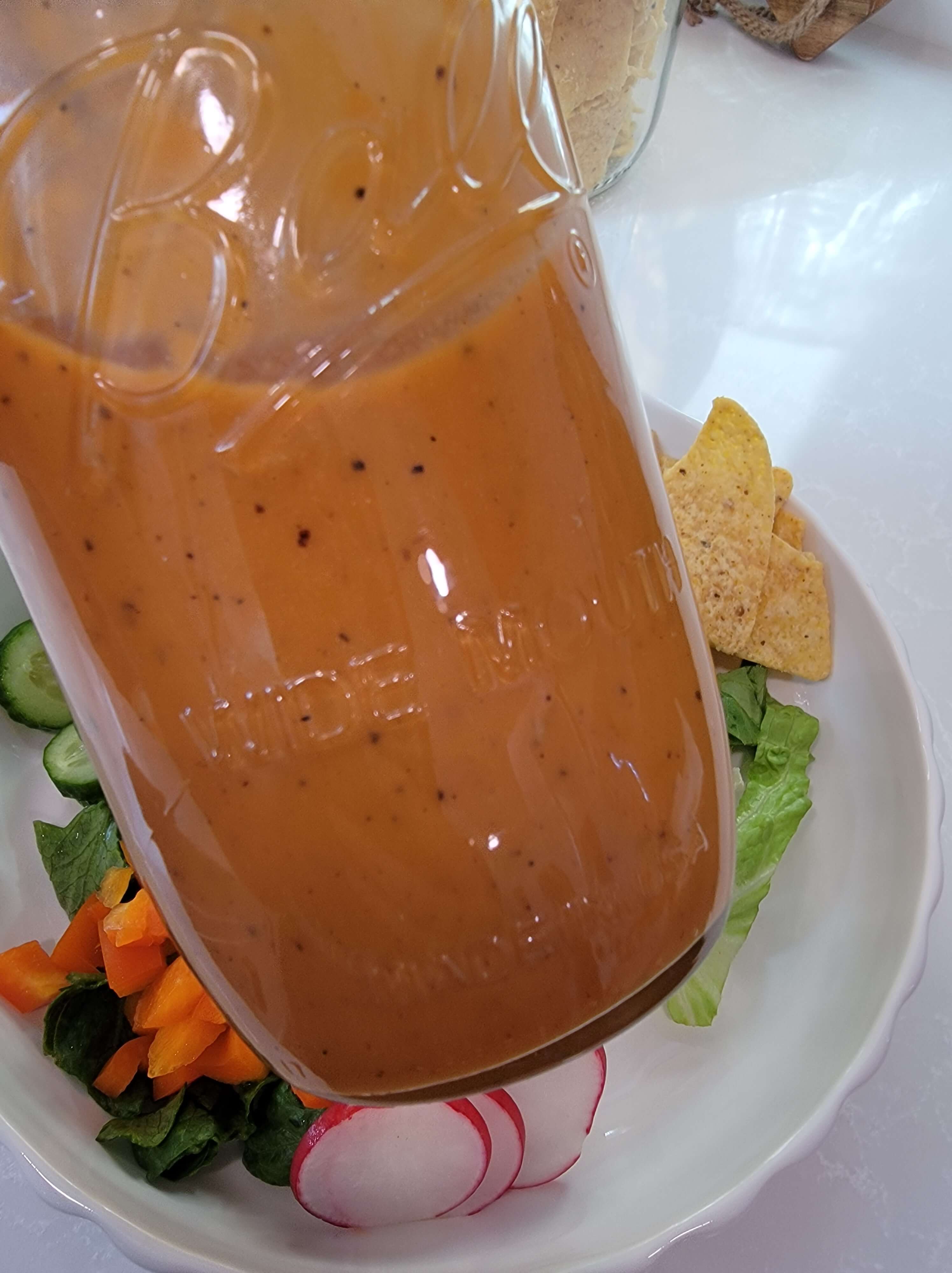 Lettuce should stay fresh an entire month when washed and stored correctly. This means that it’s easy to always have crunchy lettuce on hand for a salad when you need it. This container can hold an entire head of lettuce and keeps it fresh for about a month. The great thing about salads is that you can customize them for each person in your family. You can also switch up the toppings and dressings so that you don’t get tired of them. This is my homemade honey mustard dressing that we use for salads. I also have a delicious avocado ranch dressing and Catalina dressing if you’re looking for other options. Homemade dressings allow you to know exactly what the ingredients are in your dressing which is important to us.